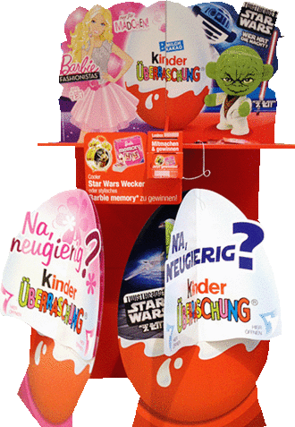 Dieser Ü-Ei Aufsteller wirbt für die Barbie Serie auf der einen Seite und der Star Wars Figuren auf der anderen Seite. In der Mitte ist die Losbox samt Gewinnspielkarten zu sehen. Unten stehen noch zwei riesen Ü-Eier aus Pappe. Für jede Serie gibt es ein passendes Ü-Ei. Alle Figuren der beiden Serien können wir im Eierlei Shop anbieten. [Zum umfangreichen Ü-Ei Shop] Danke für das Foto an Marcel Buntenbach