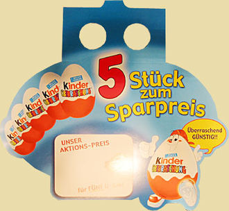 Um die Weihnachtszeit startete vereinzelt diese PAH-Aktion mit dem Slogan "5 Stück zum Sparpreis"! Jede Supermarkt Filiale hat mit diesem PAH die Möglichkeit, den Preis zu bestimmen. Der Preis wird neben dem Eiermann eingetragen, wo noch zusätzlich "UNSER AKTIONS-PREIS für fünf Ü-Eier" steht. Bitte darauf achten, dass ein PAH mit eingetragenem Preis meistens kaum noch was Wert ist. Der Eiermann befürwortet das Ganze noch mit der Spruchblase "Überraschend GÜNSTIG". [Link zu den Auktionen]