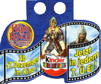 Am Montag dem 03. 11. 03 ist es soweit, die Auslieferung der neuen begehrter Herr der Ringe III beginnt! Der Beginn der Auslieferung bedeutet, dass im Laufe der Woche nach und nach erst die Filialen und der Großhandel mit den Figuren beliefert werden. Wo genau die ersten Figuren zu bekommen sein werden, ist ab Montag das Top Thema in unserem Forum und Chat. Tipp: Bis jetzt waren immer am meisten Figuren zum Serienstart in den 72er Theken Display zu finden und nicht in den 864er Aufstellern. Warum das so ist, weiß wohl nur Ferrero. Das Erschütteln der Herr der Ringe Figuren sollte sehr schwer sein, da es bis auf Bilbo und Gollum alles Steckfiguren sind, die somit rascheln wie andere Inhalte. Am besten viele Ü-Eier kaufen, dann bekommt man auch viel Figuren ;-) [Zum Forum] [Spezialinformationen zu Herr der Ringe III Figuren]