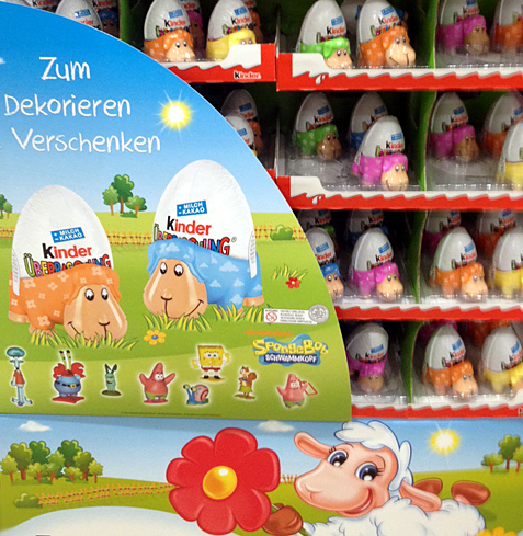 Auf dem Bild ist ein Ü-Ei Aufsteller von Ostern 2015 zu sehen. Die Ü-Eier sind in Schaf Eierbechern. Von den Schafen gibt es unterschiedliche Farben. In den Kinderüberraschungseiern stecken Figuren von SpongeBob. Der Satz umfasst 8 Figuren. Quelle und [Zu bekommen in dieser eBay Auktion].