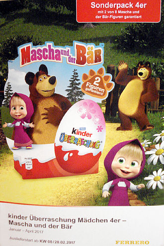 Auf dem Ferrero Werbeblatt ist das 4er Pack von Mascha und der Bär zu sehen. In der Bärentatze auf dem 4er Pack steht 2 Figuren garantiert. In der Fußzeile ist zu lesen, dass die Serie von Januar bis April im Ü-Ei stecken wird. Auslieferungsstart ist der 20. 02. 2017. Das untere Bild zeigt alle acht Figuren der Serie mit Namen. Quelle: [Diese eBay Auktion]