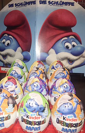 In Österreich sind die ersten Maxi Eier mit den Schlümpfen zu bekommen. Auf dem Foto rechts ist der Aufsteller zu sehen. Die Folie der Maxi Ü-Eier zeigt eine von den fünf Figuren der Serie. Besonders ansprechend ist, dass es vier Schlumpfhäuser gibt, passend zum Titel der Serie "Das verlorende Dorf". Zu Papaschlumpf gehört kein Haus, aber dafür hat er einen Tisch zum experimentieren ;-)Die entsprechenden Aufkleber auf Folie geben dem ganzen Schlumpfdorf schöne Details. Quelle [und zu bekommen in dieser eBay Auktion].