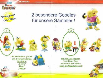 Das Bild zeigt alle 10 Figuren der kommenden Sommerserie. Die Serie trägt den Titel "Strand-Nasen im Club-Urlaub". Von der umkreisten Figur mit der 1 über dem Kopf wird es drei Varianten geben. Die Figur Namens "Ari Widertschi" stellt einen Tramper dar, der ein Schild in der Hand hält, wo es hingehen soll. Von diesen Schildern gibt es drei unterschiedliche mit den Aufschriften "Sonne", "Heim" und "WEG"! Der Satz besteht aus 10 Goodies Figuren. Die zweite umkreiste Figur heißt "Ronni Rost". Von der Figur Ronni Rost gibt es 100. 000 Figuren, wo die Würstchen bei Sonnenlicht rot werden.