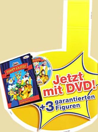 Ende November kommt die Sonderverpackung zu den Funny Castle raus. Bei der Sonderverpackung wird eine Werbe DVD dabei sein. Genau auf diese DVD weist dieser PAH hin. Die Sonderverpackung beinhaltet 6 Ü-Eier. Der PAH bestätigt, dass die Hälfte der Eier mit einer Funny Castle Figur bestückt sein wird. Wir befürchten, dass die Sonderverpackung mit Figurengarantie und DVD nicht gerade billig sein wird, aber da lassen wir uns überraschen. [Im Shop gibt es alle Funny Castle Figuren][Link zu den Auktionen]