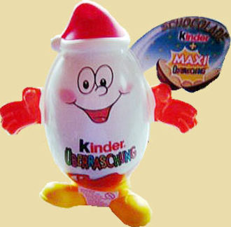 In Taiwan sind diese beiden Ü-Ei Kissen erschienen. Damit die Größe besser eingeschätzt werden kann, ist ein Ü-Ei auf dem Bild zu sehen. Quelle: Diese beiden Auktionen [Kissen gelb] [Kissen braun] 2008 wird es in den Maxi Ü-Eiern unter anderem diesen Smart im Ferrero Kinder Look geben. In Italien gibt es zu der Magic Sport Serie dieses Fan Set. Das Set besteht nur aus einem Stiftaufsatz und einer Ballklatsche. Ein Fan Trikot als Schlüsselanhänger ist nicht dabei. Aus Frankreich kommt dieser Eiermann als Weihnachtsmann. Der Weihnachtsmann ist nur Testware. Es handelt sich um ein Mini Maxi Ei, in dem die Baby Looney Tunes in den Eiern stecken. Unserer Meinung nach eine tolle Sache, weil nicht nur die Umverpackung die Form hat, sondern auch die Schokolade.