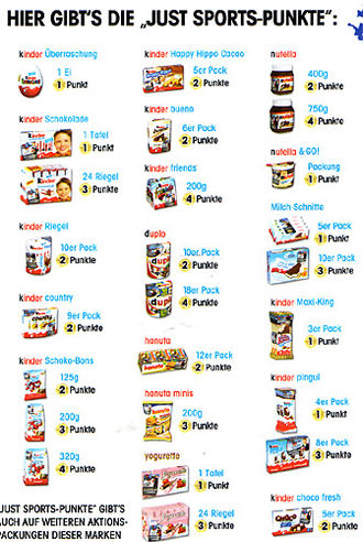 Da wesentliche Fragen zur brandneuen Just Sport Aktion von Ferrero noch offen waren, kommt dieser Nachtrag. Auf dem Bild sind alle Artikel zu sehen, die mit Sammelpunkten versehen sind. Die Sammelpunkte müssen wieder aus der Verpackung geschnitten werden und ins Sammelheft eingeklebt werden. Je nach Anzahl der gesammelten Punkte gibt es eine Prämie. Häufig sind die Sammelhefte schnell vergriffen. Letztlich kein Problem, da auf www. justsports. de ein Sammelheft als *. pdf Datei runtergeladen werden kann. Die Just Sport Auktion läuft bis zum 30. 05. 2009. Weitere Informationen findet ihr auf Justsports. de.