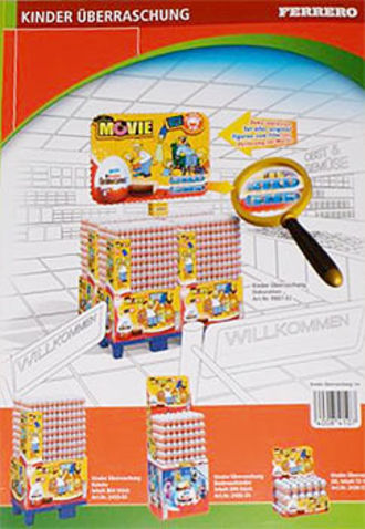 Diesem Werbeblatt kann man entnehmen, dass es einen Figuren Satz der Simpsons in jedem Supermarkt zu gewinnen gibt. Die Lupe vergrößert den in zwei Plastikröhren befindlichen Satz. Bis jetzt war es immer so, dass zur Teilnahme nur eine Art Postkarte ausgefüllt werden musste. Das große Pappschild in der Mitte wirbt für den Film der Simpsons. Unten auf dem Webeblatt sind zwei Aufsteller und ein Thekendisplay der Simsons abgebildet. Palettenanhänger sind nicht zu sehen, aber Kantenschoner.