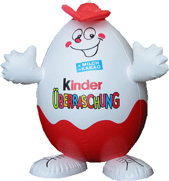 Diesen aufblasbaren Eiermann gibt es als Werbeartikel schon länger. Neu ist die überarbeitete Version. Der Schrifttzug "ÜBERRASCHUNG" erscheint in bunten Farben. Das Rot war bei der alten Ausführung mehr orange, jetzt ist es schön knallig rot wie beim original Ü-Ei. Auf der Rückseite des Eiermannes steht der gleiche Schriftzug noch einmal. Der Eiermann hat eine satte Höhe von 75 cm. Oben am Cappy ist eine Öse mit Band, wo der Eiermann mit unter die Decke gehängt werden kann. Die Füße sind von unten mit Pappe ausgeschlagen, so dass der Eierman auch auf den Boden gestellt werden kann. Zu bekommen ist der Eiermann im [Eierlei Shop].