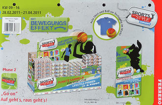 Dieses Werbeblatt zeigt, dass es ab Montag extra Aufsteller von Ferrero von den Sammelpunkten gibt. Wer diese Aufsteller sieht, kann vor Ort sogar noch an einer Verlosung teilnehmen. Dies sind die Prämien: Basketball, CAP, DAMEN T-Shirt, Polo Shirt, Rucksack, Umhängetasche, Hoodie und ein MP3-Player. Wer es nicht auf die tollen Prämen abgezielt hat, kann die Sammelpunkte zum tauschen oder sogar verkaufen nutzen. [Live Suche auf eBay nach den Kappa Prämien und dem Verkaufswert der Sammelpunkte]