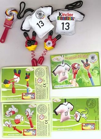 Auf dem Bild zu sehen ist das komplette deutsche Fan Set zur Weltmeisterschaft. Links oben ist ein Ball mit Griff, mit dem man klackern kann. Daneben ist das Deutschland Trikot mit der Nummer 13 von vorne und hinten zu sehen, es dient als Schlüsselanhänger. Unter dem Trikot ist ein Stiftaufsatz in Deutschland Farben (ebenfalls von vorn und hinten abgebildet). Nach unseren Informationen handelt es sich bei dem Fan Set um Inhalte aus der kommenden 7er Sonderverpackung der Magic Sports. Im Eierlei Shop gibt es alle Einzelfiguren der Magic Sport Serie und den Komplettsatz. [Zum Eierlei Shop]