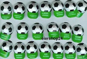 Zur Weltmeisterschaft gibt es diese Fan Cap\'s auf den Ü-Eiern im Fußball Look. Auf dem grünen Schirm sind unterschiedliche Sprüchen zu finden. Hinzu kommen noch die Cap\'s von den Ländern die an der Weltmeisterschaft teilnehmen [News von 8. 1. 2006]. Quelle: [Diese eBay Auktion]