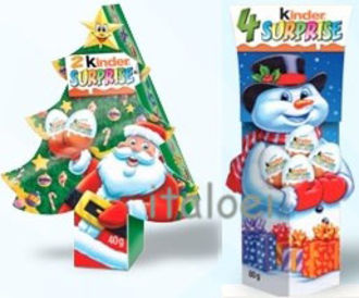 Aus Kanada kommt dieses 2er Pack als Tannenbaum und das 4er Pack als Schneemann. Zum 30 jährigen Jubiläum gab es in Frankreich die Schneekugel, sie soll auf 150 Stück limitiert sein. Als Werbeartikel gab es das 1er Pack in Russland. Rechts zu sehen ist ein 24er Display KinderJoy vom Monster Hotel aus Rumänien