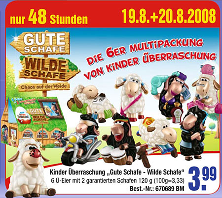 In der nächsten Woche wird bei Schlecker das 6er Pack für 3. 99 Euro angeboten. Die Aktion geht nur über 2 Tage. 2 Figuren der Serie werden garantiert. [Suche auf eBay nach den Schafen]