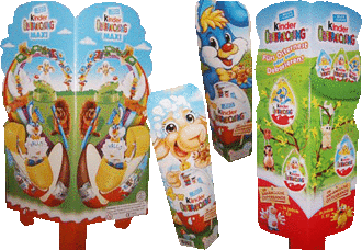 Der erste Kantenschoner wirbt für die Maxi Eier zu Ostern. In der Mitte sind zwei 4er Pack der anhänglichen Osterbande von der Vorderseite zu sehen. Der hintere Kantenschoner gibt preis, dass es von der anhänglichen Osterbande drei verschiedene Ü-Ei-Ostermotive fürs Osternest gibt. [Jetzt zu bekommen im umfangreichen Eierlei Shop]