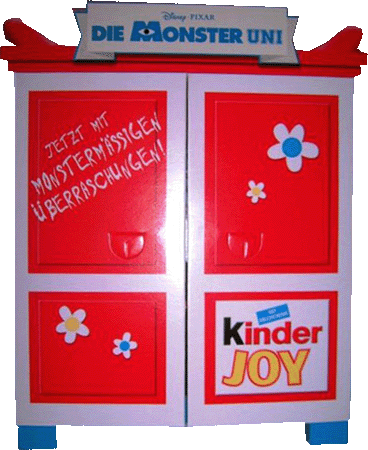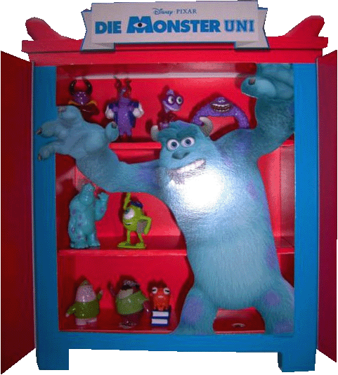 Das Diorama der neuen Serie "Die Monster Uni" ist ein Schrank. Damit bewahrheitet sich wieder was aus der Ü-Ei Gerüchteküche. Auf der Schranktür steht "Jetzt mit monstermäßigen Überraschungen". Die Auslieferung der Serie wird im Mai anlaufen. Die Serie steckt im Kinder JOY Ei, auch Sommerei genannt. [Das erste Diorama der Serie ist jetzt auf eBay zu bekommen]. Im geöffneten Zustand sollte Sulley (das große blaue Monster) einen gleich erschrecken. Im Schrank sind die 9 Figuren der Serie zu sehen. Bei den Figuren handelt es sich um Charaktere aus dem neuen Film, der am 20. 6. 2013 startet. [Hier gehts zum deutschen Trailer in HD von "Die Monster Uni"].