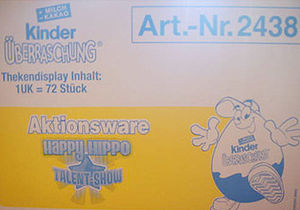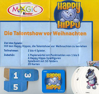 Langsam aber sicher gibt es die Happy Hippos in den Läden zu kaufen. Das 6er Pack ist noch nicht überall zu bekommen, aber bis Ende der kommenden Woche sollten die angehenden Stars überall erhältlich sein. Das Bild zeigt einen Umkarton von den neuen Eiern. Im Karton ist ein 72er Thekendisplay. Aus dem Maxi Ei kommt dieses Spiel. Der Würfel ist aus Pappe und muss zusammengestellt werden. Als Spielfiguren dienen die Pappbilder unten rechts auf dem Bild. Schön wäre gewesen, wenn gleich 2 Figuren der Happy Hippos im Maxi Ei dabei wären, so wie es früher der Fall war mit Donald oder den Schlumpf Figuren. Danke an Mario Zu bekommen in dieser eBay Auktion
