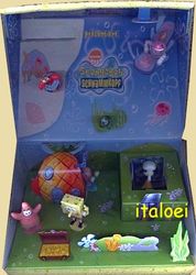Das Bild zeigt uns die ersten Figurenbilder der kommenden Spongebob Schwammkopf Serie. Es scheint, dass nicht alle Figuren in dem Diorama enthalten sind, da nur 6 Figuren auf dem ersten Blick ausgemacht werden können. Vielleicht ist noch eine irgendwo versteckt. Das es aber 10 Stück sind, ist sehr unwahrscheinlich. Das Diorama ist ein Schwamm der aufgeklappt werden kann. Im Diorama ist unten der Meeresgrund und ringsum das Wasser zu sehen mit den Ü-Ei Figuren, Quallen, Luftblasen, Algen, ein Schatz und einem Häuschen. Danke an Dietmar für das Bild! [Quelle: www. italoei. at] [Direkter Link zu der eBay Auktion vom SpongeBob Diorama]