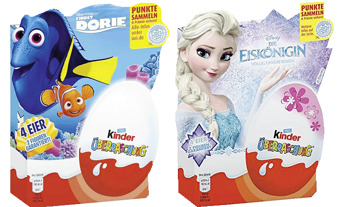 In den beiden 4er Packs werden 2 Figuren zur jeweiligen Serie garantiert. Oben rechts auf der Packung gibt es einen Sammelpunkt zum Ausschneiden. Anscheinend hat das Ü-Ei selbst ein Facelifting bekommen, der Schriftzug schaut frischer aus.