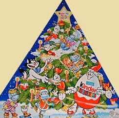 Das linke Bild zeigt den noch nicht vorgestellten "Kinder Mix Advents-Kalender 2004". Die 24 Inhalte bestehen aus 6 Kinder Riegeln, 6 Happy Hippo Croki, 12 Schoko Bons und 6 Überraschungseiern. Das rechte Bild zeigt den bereits vorgestellten Adventskalender 2004.