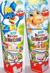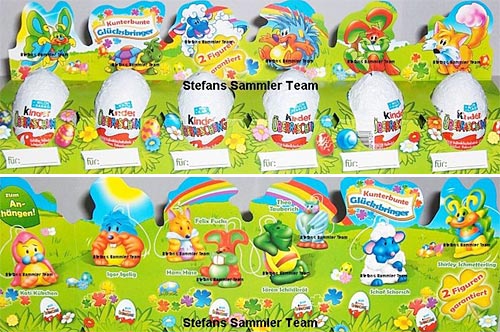 Mit den beiden 4er Packs der Kunterbunten Glücksbringer ist bestätig, dass es die Serie in Deutschland gibt. Die beiden 4er Packs sind mit dem Osterhasen und dem Lamm für die Ostertage designt. In dem kaum lesbaren grünen Osterei steht "1 Figur garantiert". Dies Bild zeigt ein 6er Pack der Serie Kunterbunte Glücksbringer. Die Ü-Eier können zu einzelnen Packs getrennt werden. Auf der Verpackung kann man einen Namen eintragen. Die Rückseite zeigt alle 8 Figuren der Serie mit Namen. Pro 6er Pack werden zwei Figuren garantiert.