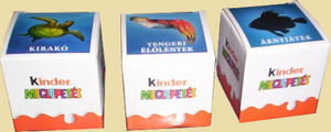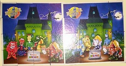 Dieses Bild kommt aus einer französischen Zeitschrift. Das Ei ist aus Blech und hat die unglaubliche Höhe von 32cm. Bei diesem außergewöhnlichen riesen Ü-Ei handelt es sich um das 30 Jahre Jubiläums Ei. Die Inhalte sind eine Uhr oder T-Shirt. Quelle: [Mary-Line] Aus Ungarn kommen die beiden Werbepuzzle des Monsterhotels. Hierbei handelt es sich nicht um die typischen Ferrero Puzzle. Tja, diese Würfel sind uns ein kleines Rätsel. Es steht zwar drauf "Kinder Überraschung", aber ob ein Ü-Ei drin ist oder das Tier welches auf dem Deckel ist wissen wir noch nicht. Danke an Gabor für die Bilder