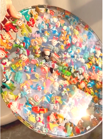 Mit den bunten Figuren und Spielzeug aus dem Überraschungsei lassen interessante Hingucker kreieren. In einem Instagram Video ist zu sehen, wie diese kleine runde Tischplatte mit Epoxidharz gegossen wird [Link zum Video].