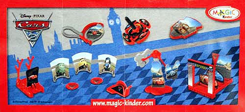 In der Ukraine ist jetzt die Serie "Cars 2" von Disney Pixar rausgekommen. Die Cars stecken in den Kinder Joy Eiern. Der Satz besteht aus 9 Autos. Hinzu kommt noch dieser serienbezogene Spielzeugsatz von Cars 2. Der Satz besteht aus 7 Spielzeugen.