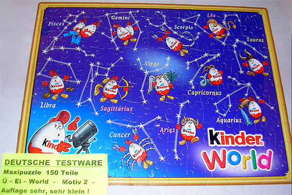 Der Eiermann beinhaltet ein Maxi Puzzle. An der Seite vom Eiermann ist eine kleines Schild mit der Aufschrift "mit ÜBERRASCHUNG". Leider handelt es sich bei dem Eiermann nur um Testware. Insgesamt gibt es zwei ähnliche Puzzle im Eiermann. Ein Puzzle ist weiter unten zu sehen. Das Puzzle besteht aus 150 Teilen und es gibt einen BPZ dazu. Die Puzzle heißen "KINDER WORLD". Die Puzzle leuchten im Dunkeln durch eine fluoreszierende Auflage.
