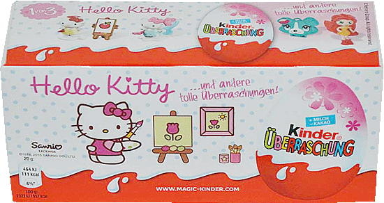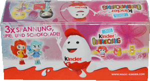 Dies sind die beiden aktuellen 3er Packs aus Österreich und der Schweiz. Oben auf der Verpackung steht 1 von 3 Hello Kitty. Wie die Verpackung zeigt, ist dieses 3er Pack für Girls. Der Werbeslogan auf der Verpackung lautet "3X SPANNUNG, SPIEL UND SCHOKOLADE!". Für Ü-Ei Folien Sammler sollte interessant sein, dass die Girls Eier einen rosa Schweif im oberen Bereich haben.