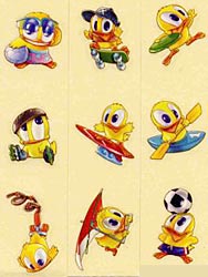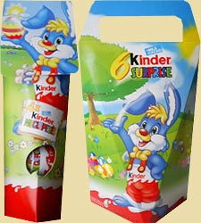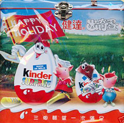 Aus Taiwan kommt dieses eirige Propellerflugzeug. Auf der Verpackung sind Passenderweise Ü-Eier und der Eiermann. [Zu bekommen in dieser eBay Auktion] Das Bild zeigt einen Satz Sticker der Sporty Chicks aus Italien. Den Satz gibt es in den "Mini-Gransorpresa" Eiern. Quelle: [Diese eBay Auktion] Diesen Blechkoffer gibt es in Hong Kong. Im Koffer sind zwei 3er Packs In Ungarn gibt es diese 4er und 6er Packs zu Ostern.