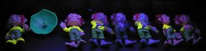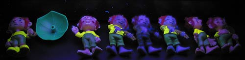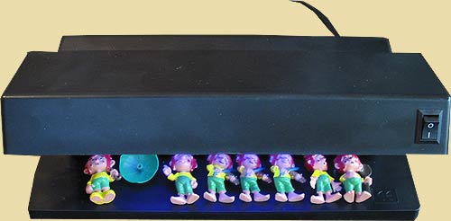 In der letzen Zeit haben wir viel über Ü-Ei Fälschungen (Plagiate) berichtet. Als beste Waffe eine Fälschung schnell und zuverlässig zu entlarven hat sich immer wieder das UV Licht bewährt. Aus diesem Grund möchten wir genauer darauf eingehen. Für den mobilen Einsatz auf Ü-Ei Börsen oder Flohmärkten hat sich diese leistungsstarke Handlampe bewährt. Generell ist eine Handlampe deutlich schwächer als die stationären UV Lichtprüfer, aber 4 Batterien sorgen für ein leistungsstarkes Licht. Gerade bei der mobilen UV Licht Lampe muss der UV Lichttest in einer Verdunklung stattfinden, wie in einem Rücksack, einer Kiste oder in den Händen z. B. ! Die mobile UV Licht Lampe hat sogar noch eine Taschenlampe integriert. Diese stationäre Lampe hat eine starke 12 Watt Leistung. An der Gerätefront ist ein gut erreichbarer An- und Ausschalter angebracht. Der Prüfbereich ist durch das überstehende Gehäuse vor direktem Lichteinfall geschützt, trotzdem wird das Ergebnis viel deutlicher im Dunkeln, wie auf dem untersten Bild zu sehen ist. Hier kann jeder schnell erkennen, welcher Pumuckl kein original ist. Die Fläche, um eine oder bis zu 10 Figuren zum direkten Vergleich darunter zu legen, ist optimal. Der UV Licht Test zur Unterscheidung von Fälschung und Original sprechen für sich, so dass wir uns entschieden haben, beide vorgestellten UV Licht Lampen mit im umfangreiche Shop Sortiment aufzunehmen. Neu im Shop hinzugekommen sind noch kostbare Schlümpfe wie der Flötenschlumpf, kleine alte Zwerge von 1978 und die alten Saurier. Neben den neuen Ü-Ei Figuren sind 110 Ü-Ei Artikel im Sonderangebot, wobei sich sogar ein Eierlaufschlumpf darunter befindet. [Direkt zum Eierlei Shop]