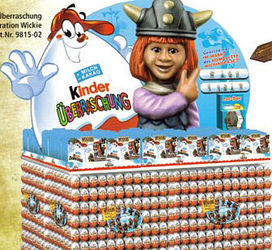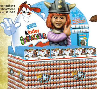 Dieser Detailausschnitt von Wickie zeigt, dass sich laut dem Werbeblatt Palettenanhänger an den Aufstellern befinden werden. Auf den Ü-Ei Paletten stehen die 6er Packs von Wickie. Im Eierlei Shop können wir sehr viele PAH zu günstigen Preisen anbieten [Ü-Ei Shop].