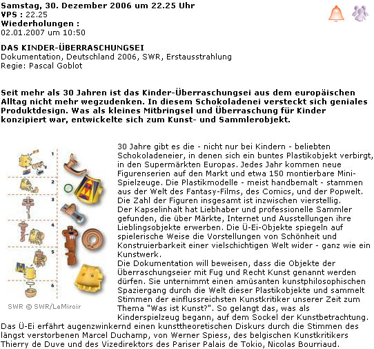 Am Samstag den 30. 12. läuft auf Arte eine 30 minütige Dokumentation unter dem Titel "Das Kinder- Überraschungsei". Das Bild zeigt die Ankündigung auf arte. tv! Lassen wir uns überraschen, inwieweit neue, der Sammlerwelt nicht bekannte Einblicke gezeigt werden. Wiederholung am 02. 01. 07 um 10. 50 Uhr!