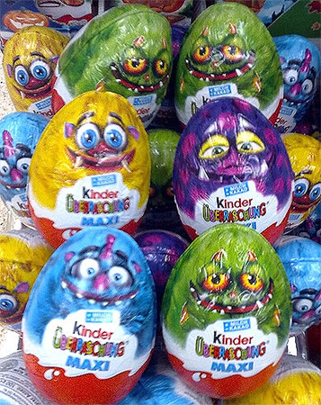 In Deutschland wurden diese gruseligen Maxieier gesichtet. Es sind 4 unterschiedliche Designs. Irgendwie sind alle Designs gruselig und witzig zugleich. Den Inhalt gibt die Verpackung nicht preis. Bei den "MAXI" Eiern soll es sich um Testware handeln.