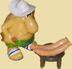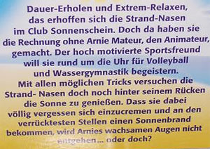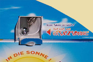 Dieser Detailausschnitt des Dioramas der Strandnasen zeigt, dass sich hier ein kleines Fach befindet hinter der Möwe. In dem Fach ist eine Taschenlampe mit der die Standnasen gleich auf ihre Funktionalität getestet werden können. Neben dem Fach steht der Text "Keine Sonne in Sicht? Hier geht\'s zur ERSATZSONNE!". Der Arnie Mateur wurde damit bestrahlt und die Nase ist rot geworden. Ein paar Minuten später wird die Nase wieder hautfarben. Diese Geschichte der Strandnasen steht auf dem Diorama. Bei Ronnie Rost werden die Brautwürstchen aus dem Diorama nicht rot oder braun. Alle Figuren der Serie gibt es in großem Bildformat in unserem Forum, genau wie weitere Bilder vom Diorama. [Direkter Link zum Forum Beitrag der Strandnasen]
