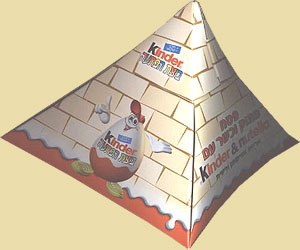 Diese Ü-Ei Testware ist zu Ostern in Luxemburg erschienen. Insgesamt enthält die Sonderverpackung 7 Ü-Eier. Auf der Rückseite befindet sich ein Osterwürfelspiel mit Hühnern. [Quelle diese eBay Auktion] Diese außergewöhnliche Pyramidenverpackung kommt aus Israel. Enthalten sind zwei Ü-Eier, ein Glas Nutella und Kinderriegel. Quelle: [Sofia]