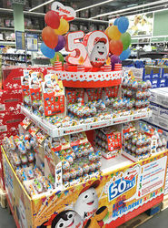 Aus einenm russischem Supermarkt kommt dieses Foto. Zu sehen ist ein imposantes Gebinde vom Kinder Überraschungsei.