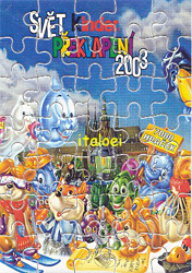In Brasilien werden 1er Packs von Tom & Jerry erscheinen. Die 1ers Pack gibt es in unterschiedlichen Layouts. Das Bild links zeigt eine Seite des 1er Packs. Mehr Bilder unter www. italoei. at! Das Puzzle rechts besteht aus 35 Teile und zeigt einen Querschnitt an ausländischen Figuren. Von dem Puzzle soll es nur 50 Stück geben und wurde wohl als Präsent von Ferrero ausgegeben. In Tschechien kommen jetzt die Ötzis, Titel "CHLAPCI Z PALEOLITU". Zur Serie gibt es ein Buchhüllen Diorama. Weitere Bilder auf italoei. at!