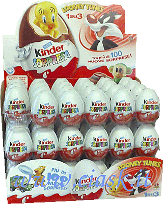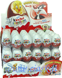 In Italien gibt es Toni Turntable in dieser Verpackung. Es sieht so aus, als wenn der Toni nicht in einer extra Plastiktüte verschweisst ist, wie es bei den deutschen Figuren der Fall ist. Des Weiteren ist es wieder die große Ausführung. Vor dem Mischpult ist kein Aufdruck zu sehen, wie bei den deutschen Figuren. Weiter geht es in Italien mit diesem Thekendisplay der "Looney Tunes Active! Winter Sports". Es wird damit geworben, dass in jedem dritten Ei eine Figur der Looney Tunes steckt. In den Ü-Eiern soll es gleichzeitig 100 neue Überraschungen geben. Die Ü-Ei Verpackung besteht aus zwei Hälften, was die Ü-Eier sehr schön glatt und glänzend macht. [Den neuen Satz können wir schon im Shop anbieten. ]