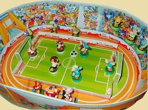 Im geschlossenem Zustand sieht das Diorama aus wie die Allianz Arena bei nächtlicher blauer Beleuchtung. Links ist sogar das neue "Ü-Ei" Logo zu sehen, so wie es auf der neuen Verpackung der Ü-Eier ist. Im Stadion Diorama haben alle 5 Mannschaften Platz gefunden. Auf dem Spielfeld tragen gerade zwei Mannschaften ein Spiel aus. Quelle: [Diese eBay Auktion]