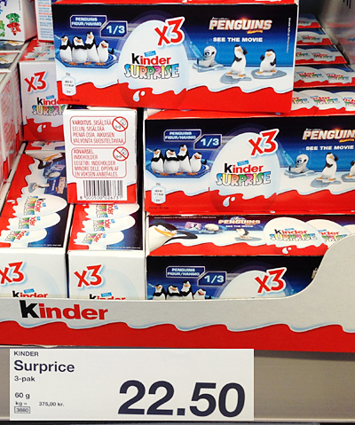 Diese 3er Packs von den Penguins gibt es in Dänemark. Es wird pro Packung eine Pinguin Figur garantiert. Der Preis beträgt 22,50 Kronen. Das sind 2,25 Euro.
