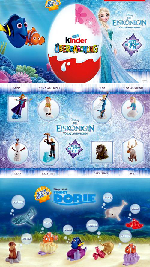 Das erste Werbeblatt zeigt in der Mitte das Kinder Überraschungsei. Links davon sind Dorie und Nemo zu sehen. Auf der rechten Seite steht die Eiskönigin. Auf dem Bild darunter sind die acht Figuren vom neuen Film "Die Eiskönigin vollig unverfroren" abgebildet. Unter jeder Figur steht der Name. Oben links geht es los mit ANNA, ANNA ALS KIND, ELSA, ELSA ALS KIND, OLAF, KRISTOFF, PAPA TROLL und SVEN. Das untere Bild zeigt uns die acht Figuren aus dem neuen DISNEY PIXAR Film "Findet DORIE". Wir starten wieder oben links mit DESTINY, OTTER, NEMO, DORIE, KRABBE, BAILEY, FRANK und MARLIN. Quelle [Diese eBay Auktion]