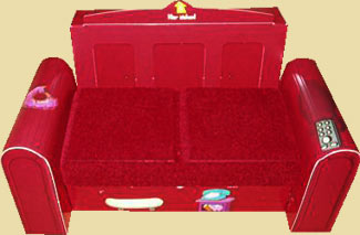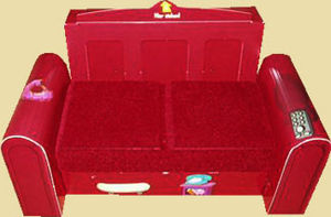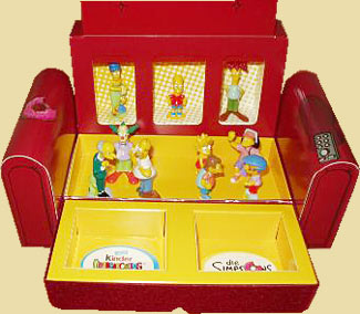 Im geschlossenen Zustand kann man deutlich erkennen, dass es sich um das Simpsons Sofa handelt. Vorne vor auf dem Sofa ist ein Skateboard und ein Telefon abgebildet. Auf den Sofalehnen liegt ein angebissener Donat und auf der anderen Seite die Fernbedienung. An der Sofarückenlehne ist eine gelber Pfeil der nach oben zeigt. Wenn die Lasche mit dem gelben Pfeil nach oben gezogen wird, geht quasi der Vorhang auf für die ersten 3 Simpsons Figuren Marge, Bart und Sideshow Bob. Die anderen 7 Figuren befinden sich unter den Sofakissen. Es geht los mit Mr. Burns, Krusty und Homer und unter dem rechten Sofakissen stehen Lisa, Nelson, Milhouse und Otto. In den Einbuchtungen von den aufgeklappten Sofakissen sind noch zwei Aufkleber, einmal von Kinder Überraschung und das Logo "Die Simpsons". Das erste Diorama wurde für über 100 Euro verkauft. Jetzt sind schon mehrere Simpsons Dioramen auf eBay zu finden, daher die besseren Bilder. [Diese Lifesuche findet die aktuell eingestellten Simpsons Dioramen]