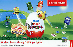 Dies ist der Palettenanhänger der Frühlingshüpfer. Auslieferungsstart ist laut Werbeblatt der 06. 02. 12, aber die ersten Eier sind schon jetzt zu bekommen. Hier noch ein Werbeblatt zur Serie. Der Satz besteht aus 8 Hüpffiguren. Es gibt schon die ersten Auktionen zur Serie: [Live Suche auf eBay nach den Frühlingshüpfern starten]