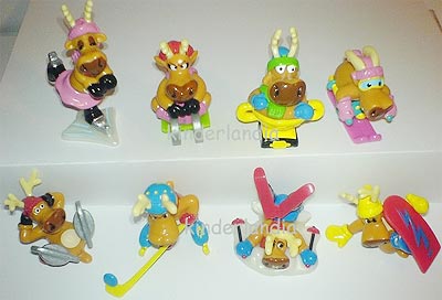 Das sind die 8 Rentiere die uns im Adventskalender 2006 erwarten. Die Figuren sehen sehr empfindlich aus und sind mit reichlich Zubehör ausgestattet. Die Namen von links oben: Kate Skate, Funny Fast, Happy Cup, Furty Fly, Nick Panic, Ice Ok, Paul Fall, Ike Pike. Oben links auf dem BPZ ist das Logo zur Serie zu sehen, im Logo steht "Show on Ice".