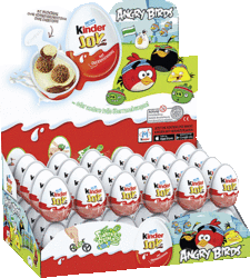 Ende des Monats ist der Auslieferungsstart vom neuen Kinder Joy Ei (Sommerei). Die Hauptfiguren sind Wurfspiele / Wurffiguren der Angry Birds. Die Inhalte sind auf dem unteren Foto zu sehen. Auf dem Thekendisplay steht noch ". . . . oder andere tolle Überraschungen!". Dann ist noch was von "Finger Games" auf dem Karton zu sehen.