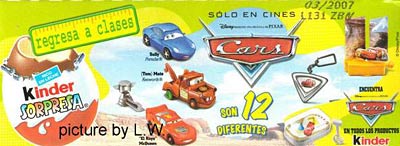In Mexiko kommt die neue Serie Disney\'s Cars. Das Bild zeigt uns die Vorderseite, auf dem alle sieben Autos zu sehen sind. Auf diesem Zettel sind noch zusätzliche Inhalte wie ein Anhänger, Magnetspiel und Abschussrampe. In Europa wird es diese Looney Tunes Serie geben. Es sind drei Schiebebilder, drei Anhänger und vier Puzzleecken.