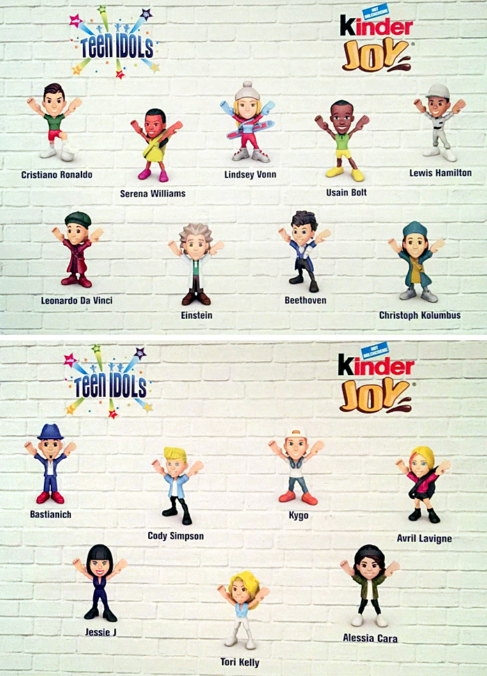 Auf dem Foto ist das Cover der "Teen Idols" zu sehen. Die Serie wird im Sommerei stecken. Laut Fotos der eBay Auktion besteht der Satz aus 16 Figuren. Das Diorama kann an zwei Seiten aufgepklappt werden, so dass alle Figuren der Serie zu sehen sind. [Quelle und zu bekommen in dieser eBay Auktion. ] Das untere Bild zeigt alle Figuren mit Namen.