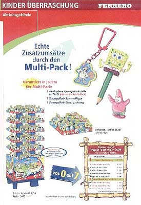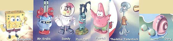 Diese Werbeblätter zeigen die kommenden 6er Packs der neuen Spongebob Figuren. Es ist das gleiche 6er Pack wie zu der Mission Maulwurf. Pro 6er Pack wird garantiert, dass 2 Ü-Eier mit Spongebob Inhalt bestückt sind. Auf dem zweiten Werbeblatt ist neben der Spongebob Serienfigur "Patrick" ein Stiftaufsatz und ein Schlüsselanhänger abgebildet. Diese Ausschnitte zeigen die kommenden 7 Spongebob Figuren, drunter stehen die Namen. Quelle der Werbeblätter und Figurenbilder: www. ue-ei-portal. de