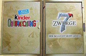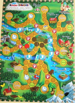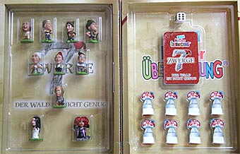 Das Diorama der 7 Zwerge ist wie ein Buch designt. In dem Buch befinden sich aber nicht nur die 10 Figuren der Serie, sondern es kann aktiv als Brettspiel benutzt werden. Wenn das Buch aufgeklappt wird befinden sich auf der linken Seite die 10 Figuren und auf der rechten Seite sind ein Würfel, Spielkarten und 8 Pilze. Das letzte Bild zeigt die Spielfläche. Quelle [Diese eBay Auktion]